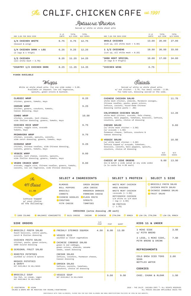 Introducing Calif Chicken Cafe, a popular spot in Los Angeles offering a delicious menu of wraps, salads, and more. Located on 2005 Westwood Blvd, this casual eatery is known for its tasty options like the Caesar Wrap, Chinese Wrap, Melrose Wrap, and Ranch Wrap. Don't miss out on their Cafe Caesar Salad or California Chicken Salad, both packed with fresh ingredients and flavorful dressings. Customers rave about the creamy Mashed Potatoes and Gravy and the Green Goddess Salad. The staff is friendly, the atmosphere is welcoming, and the food is consistently good. Whether you're dining in or taking out, Calif Chicken Cafe is a great choice for a satisfying and healthy meal. Experience the goodness of Californian cuisine at this gem of a restaurant.